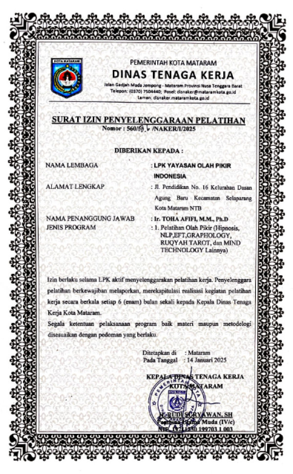 LKPS OLAH PIKIR INDONESIA (IHC) SUDAH TERDAFTAR SEBAGAI LEMBAGA PELATIHAN KERJA SWASTA RESMI DENGAN IZIN PENYELENGGARAAN KURSUS DARI DINAS KETENAGAKERJAAN KOTA MATARAM