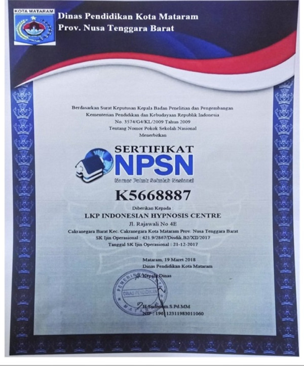 INDONESIAN HYPNOSIS CENTRE SUDAH MEMILIKI NPSN KEMENDIKBUD ( NOMOR POKOK SEKOLAH NASIONAL) MENJADI LKP HIPNOTIS PERTAMA DI INDONESIA YANG MEMILIKI IZIN RESMI (NPSN) DI INDONESIA