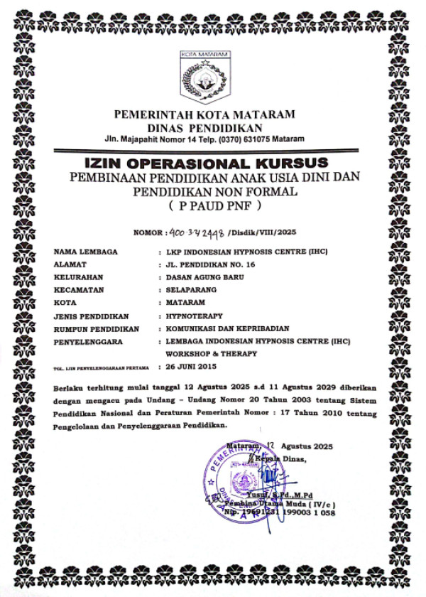 INDONESIAN HYPNOSIS CENTRE (IHC) MEMILIKI IZIN OPERATIONAL DARI DINAS PENDIDIKAN KOTA MATARAM SEBAGAI LEMBAGA KURSUS DAN PENDIDIKAN DIBIDANG HIPNOTIS DAN HIPNOTERAPI